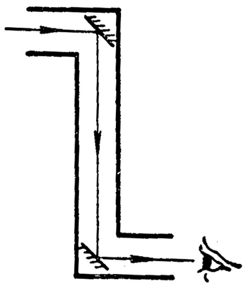 平面镜除了在生活中作镜子用,还广泛应用在各种仪器中。例如,在高一讲过的显示微小形变的装置中,在库仑扭秤装置中,都装有平面镜,用反射光线把微小效应放大。潜望镜中用平面镜来改变光线的行进方向(图 5–11)。