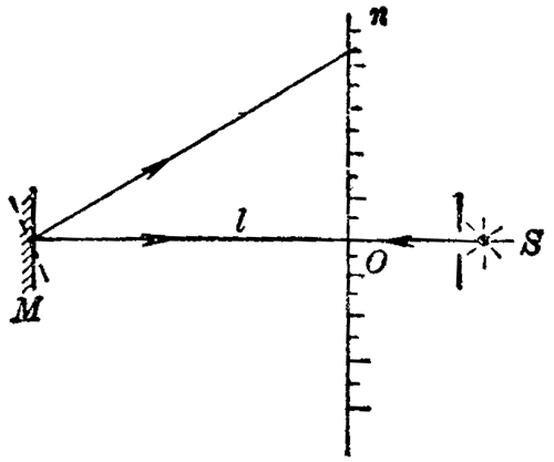 (5)图 5–13 中,M 是一个平面镜,S 是光源,通过狭缝使光线射到镜面上,M 的位置,最初是与 S 射来的光线垂直,这时反射光线射在标尺的零刻度上;当 M 转动一角度后,反射光线射到标尺的 n 刻度上。如果标尺到镜 M 的距离为 l,且 l ≫ On,求 M 转动的角度是多大。