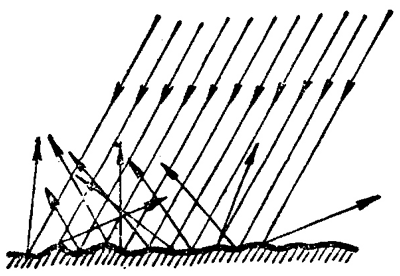 如果表面是粗糙不平的,那么沿同一方向射到面上的光线将向不同的方向反射(图 5–9),这样的反射叫做漫反射。我们能从不同方向看见本身不发光的物体,比如看见书上的字,就是因为光在纸面上发生漫反射的缘故。