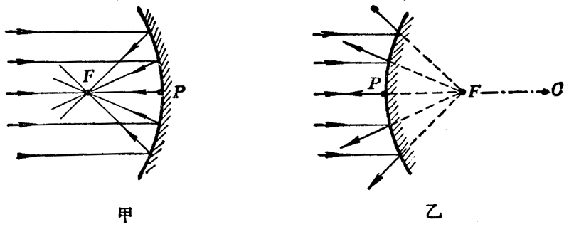 凹镜对光线起会聚作用。射到凹镜上的平行光线,被反射后会聚于一点(图 5–14 甲),这一点叫做凹镜的焦点,通常用 F 表示。如果把一张纸放在焦点,纸上会出现一个很亮的光点。凹镜的焦点是反射光线的实际会聚点,是实焦点。