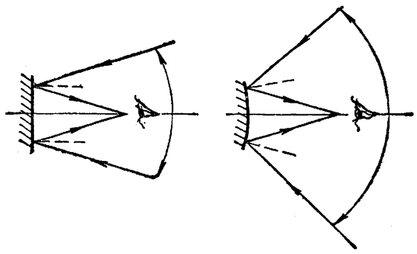 凸镜可以用来扩大观察范围。从图 5–15 可以看出,对于口径相同的平面镜和凸镜,观察者离镜同样远时,从凸镜观察到的范围要比平面镜大,用一个口径不太大的凸镜,就能观察到比较大的范围内的景像,因此,汽车上的观后镜都用凸镜。