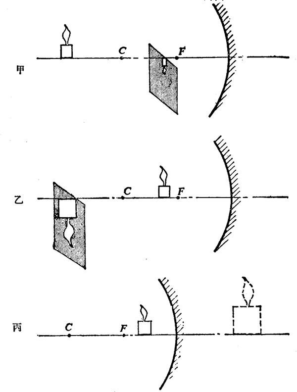 如图 5–16 所示,把一支蜡烛放在凹镜前二倍焦距以外的地方,用一张透明纸作光屏,在蜡烛和凹镜之间移动光屏,直到在光屏上出现清晰的蜡烛的像。可以看到,这时的像是倒立缩小的(图 5.16 甲)。这个像是由反射光线实际会聚而成的,能够用光屏接收到,所以光学中把这样的像叫做实像。把蜡烛向凹镜移近,同时使光屏远离凹镜,当蜡烛位于二倍焦距以内焦点以外时,从光屏上可以看到倒立放大的实像(图 5–16 乙)。使蜡灿进一步靠近镜面,当蜡烛位于焦点以内时,无论怎样移动光屏,都得不到蜡烛的像。这时向镜里看去,可以看到一个正立放大的像(图 5–16 丙)。这个像不是由反射光线实际会聚而成的,用光屏接收不到,是虚像。