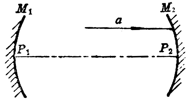 (4)如图 5–18 所示,M1 和 M2 是两个焦距相等的凹镜,其焦距为 f。要想使平行于主轴的光线 a 能在 M1 和 M2 之间来回反射,两凹镜的顶点 P1 和 P2 应相距多远?在图中标出两凹镜的焦点 F1 和 F2 的位置,并画出光线 a 被两凹镜反射的光路图。