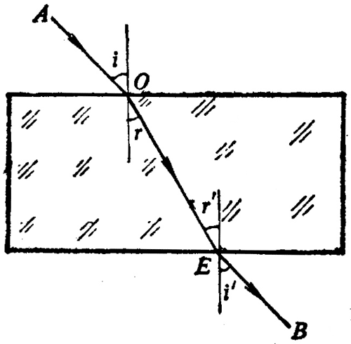 光线以入射角 i 射在玻璃砖的上表面上,经玻璃砖折射后从下表射出的光路图如图 5–21 所示。设光从空气进入玻璃砖上表面后的折射角为 r,射到下表面的入射角为 rʹ,从下表面进入空气后的折射角为 iʹ,玻璃的折射率为 n。根据光的折射定律,