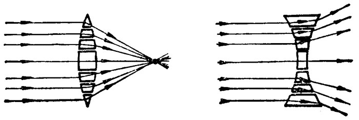凸镜为什么能使光线会聚,凹透镜为什么能使光线发散呢?其原理可用棱镜对光线的偏折作用来说明,如图 5–34 所示,透镜可以看作是由许多棱镜组成的。凸透镜上部的棱镜底面朝下,光线通过时都向下偏折;下部的棱镜底面朝上,光线通过时都向上偏折,因此,凸透镜使光线会聚。与此相反,凹透镜上部的棱镜底面朝上,光线通过时都向上偏折;下部的棱镜底面朝下,光线通过时都向下偏折。因此,凹透镜使光线发散。