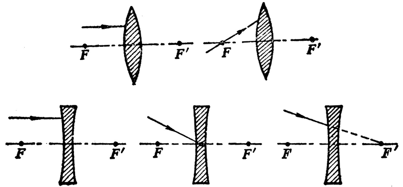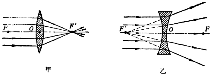 平行于主轴的光线,通过凸透镜后会聚于主轴上的一点(图 5–36 甲 Fʹ),这个点叫做凸透镜的焦点。平行于主轴的光线通过凹透镜后变得发散(图 5–36 乙),这些发散光线看起来好象是从它们的反向延长线的交点 F′ 发出来的,点 F′ 也在主轴上,叫做凹透镜的焦点。凸透镜的焦点是实焦点,凹透镜的焦点是虚焦点。