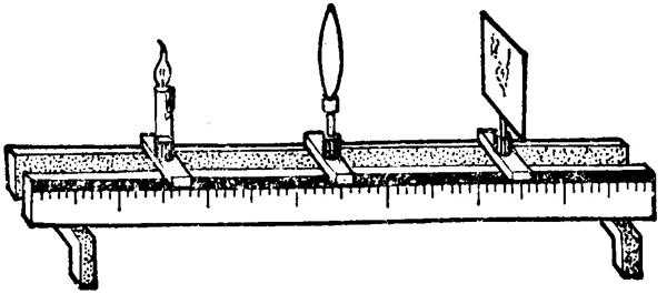 象图 5–38 那样,把蜡烛和光屏放在光具座的两端,把焦距已知的凸透镜放在蜡烛和光屏之间。调整凸透镜和光屏的高度,使烛焰的中点、凸透镜的光心、光屏的中点一样高,以使烛焰的像能成在光屏上。