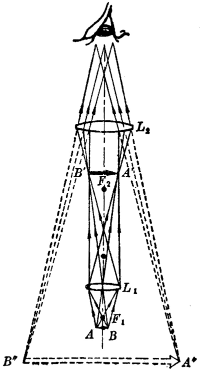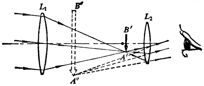 开普勒望远镜的原理如图 5–54 所示。从天体射来的平行光线,经过物镜 L1 后,在焦点以外距焦点很近的地方成一倒立缩小的实像 A′B′。目镜 L2 的前焦点和物镜的焦点是重合的,所以实像 A′B′ 位于 L2 和它的焦点之间距焦点很近的地方,L2 以 A′B′ 为物体,形成放大的虚像 A″B″。这样,当我们对着目镜观察的时候,进入眼睛的光线就好象是从 A″B″ 射来的。A″B″ 的视角大于直接用眼睛观察天体时的视角,因此从望远镜中看到的物体使人觉得离自己近了,看得清楚了。
