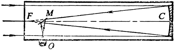 望远镜的物镜越大,进入镜中的光就越多,所成的像就越明亮清晰,这对于观察传来的光很弱的遥远星体是很重要的。但是由于制造和安装上的困难,透镜的直径很难大于 1 米,所以天文台用的大型望远镜多为反射式的。这种望远镜是牛顿在 1668 年发明的。反射式望远镜的原理如图 5–55 所示。它用一个很大的凹镜代替物镜,从遥远天体射来的平行光线,经凹镜 C 反射后,向焦点会聚,但是在光线还没有会聚到焦点以前,就被平面镜 M 反射到目镜 O 中,形成实像。反射式望远镜的凹镜可以做得很大,能够集中较多的光,使成像明亮清晰。凹镜的口径越大,能够看到的宇宙范围也就越大,现在世界上已有口径为 5 米的反射式望远镜。