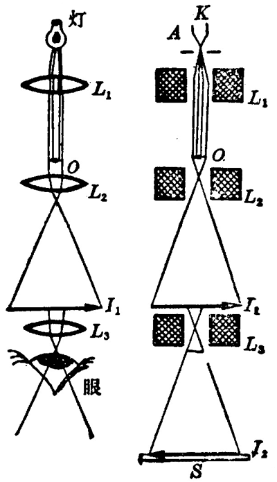 电子显微镜 电子显微镜是在本世纪三十年代出现的。它是类比于光学显微镜发展起来的,光学显徽镜是用可见光照射被研究的物体,利用光学透镜使光线偏折而成像的;电子显微镜则是让电子束穿过被研究的物体,利用电磁透镜(实际上就是按一定要求分布的空间电场和磁场)使电子束偏转而成像的,图 5–56 是用磁场聚焦的电子显微镜的示意图,为了便于类比,左边画出了光学显微镜的示意图。发射电子的阴极 K 相当于光学显微镜的光源,从阴极发射出来的电子,经过磁透镜 L1 后变为平行的电子束,L1 起聚光镜的作用,电子束穿过被研究的物体 O,产生被研究物体的透射像。磁透镜 L2 起物镜的作用,电子束通过它,放大成像 I1,I1 再经磁透镜 L3 放大,第二次成像 I2。I2 被投射在荧光屏 S 上,可以用照相方法记录下来。
