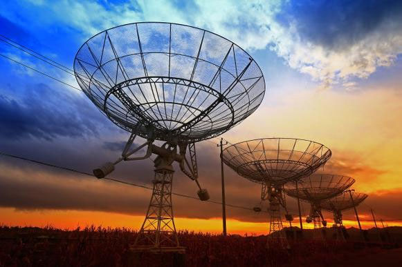 射电望远镜有各式各样的结构,图 5–57 所示的是常见的抛物面天线射电望远镜,它有一个很大的金属抛物面状天线,从宇宙空间射来的平行于抛物面轴的无线电波,被反射后集中到位于抛物面焦点处的小天线上,小天线接收到的无线电波能量通过传输线输送给接收机,接收机对电波能量进行测量,确定射电波的强度。
