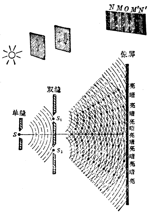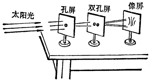 杨氏的办法是把点光源发出的一束光分成两束,以保证它们具有相同的频率和恒定的相差。实验做法如下,让太阳光照射到一个有小孔的屏上(图 6–1),这个小孔就成了一个“点光源”,光从小孔出来后,照射到第二个屏的两个小孔上,这两个小孔离得很近,而且与前一小孔的距离相等,因此,如果光是某种波动,那么任何时刻从前一小孔发出的光波都会同时传到这两个小孔,所以这两个小孔处的光振动不但频率相同,而且总是同相的。这两个小孔就成了两个相干光源,它们发出的光在像屏某处叠加时,如果同相,光就加强,如果反相,光就减弱或抵消,因此应该产生明暗条纹。实验果然产生了预期的结果,在像屏上看到了彩色的干涉条纹。