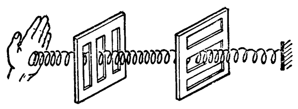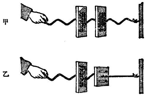 我们先用机械波来说明纵波和横波的主要区别,沿着绳传播的横波,如果在它传播的方向上放上带有狭缝的木板(图 6–11),只要狭缝的方向跟绳的振动方向相同,绳上的横波就可以毫无阻碍地传过去;如果把狭缝的方向旋转 90°,绳上的横波就不能通过了,这种现象叫做横波的偏振。纵波是沿着波的传播方向振动的,不论狭缝方向如何,纵波都可以传过去,不会发生偏振现象(图 6–12)。