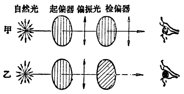 取一块电气石晶体薄片或人造偏振片[1] ,通过它观察太阳光或灯光,可以看到它是透明的。以入射光线为轴旋转晶片,这时着到的透射光的强度并不发生变化,再取一个同样的晶片,把它放在前一晶片的后面,通过它去观察从前一晶片透射过来的光,就会发现,从第二个晶片透射过来的光的强度跟两晶片的相对方向有关,把前一晶片固定,以入射光线为轴旋转后一晶片时,从后一晶片透射过来的光的强度发生周期性的变化:后一晶片转到某一方向时,透射光最强(图 6–13 甲);再旋转 90°,转到跟前一方向垂直时,透射光最弱,几乎等于零(图 6–13 乙)。