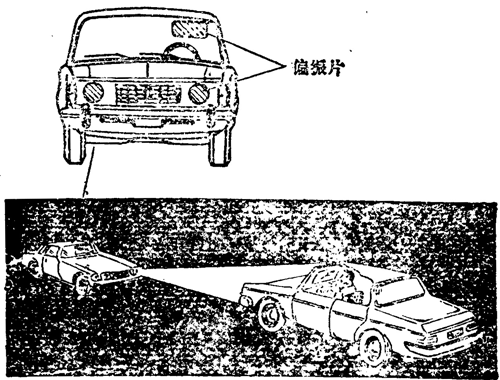 光的偏振现象在技术中有很多应用,例如,在拍摄水面下的景物或展览橱窗中的陈列品的照片时,由于从水面或窗玻璃会发出很强的反射光,使得水面下的景物和橱窗中的陈列品看不清楚,摄出的照片也模糊不清。如果在照相机镜头上加一个偏振片,使偏振片的偏振化方向与反射光的垂直,就可以把这些反射光滤掉,而摄得清晰的照片。汽车在夜间行车时,迎面开来的车灯的光常常使司机看不清路面,容易发生事故,如果在每辆汽车的车灯玻璃上和司机座席前面的窗玻璃上各安上一块偏振片,并使它们的偏振化方向都跟水平方向成 45° 角(图 6–14),就可以解决这个问题。这时,从对面车灯射来的偏振光,由于振动方向跟司机自己座前窗玻璃上偏振片的偏振化方向垂直,所以不会射进司机眼里。而从自已的车灯射出去的偏振光,由于振动方向跟自己的窗玻璃上编振片的偏振化方向相同,所以司机仍能看清自己车灯照亮的路面和物体。