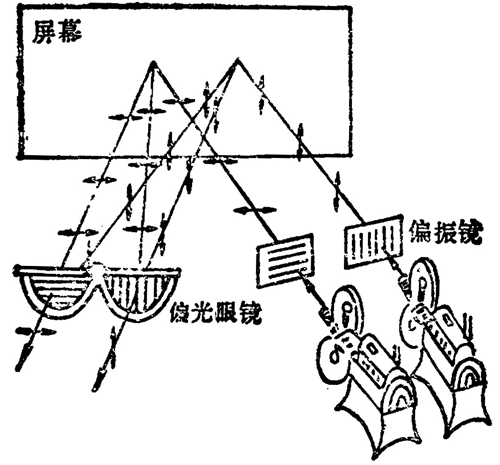 普通电影是用一架摄影机拍摄,一架放映机放映的,银幕上的画面是一幅平面图像,立体电影是用两架摄影机并排在一起,同时拍下同一景物的两幅图象,由于两架摄影机对景物的角度不同,所以拍下的两幅图像略有差别,就如同两眼看到的同一物体略有差别一样。放映时,用两架放映机把两架摄影机拍下的两组影片同步放映,使略有差别的两幅图像重叠在银幕上。这时如果用眼睛直接观看,看到的画面是模糊不清的,要看到立体电影,需要运用光的偏振知识,使两眼各看到一幅图像。在每架放映机前装一块偏振镜(图 6–15),其作用相当于起偏器,从两架放映机发出的带有影像的两束光,通过偏振镜后,就成了偏振光,左右两架放映机前的偏振镜的偏振化方向互相垂直,因此产生的两束偏振光的偏振方向也互相垂直。这两束偏振光投射到银幕上再反射到观众,偏振方向不改变。观众戴的眼镜是一副偏光眼镜,相当于检偏器,偏光眼镜的两只镜片的偏振化方向也是互相垂直的,而且左眼镜片的偏振化方向跟左边放映机前偏振镜的一致,右眼镜片的偏振化方向跟右边放映机前偏振镜的一致。这样,左眼只能看到左机映出的画面,右眼只能看到右机映出的画面,两眼看到的画面略有差别,因而产生立体感。