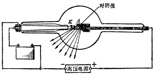 比紫外线波长还短的电磁波,有伦琴射线。德国物理学家伦琴(1845 ~ 1923)在 1895 年研究阴极射线的性质时,发现阴极射线的高速电子流射到玻璃管壁上,管壁会发出一种看不见的射线,这种射线的穿透本领很大,能使放在厚纸后面的荧光物质铂氰化钡发出荧光,并能使包在黑纸里的照相底片感光,伦琴当时不知道这是什么射线,把它叫做 X 射线。后来人们做了大量实验,发现高速电子流射到任何固体上,都会产生这种射线,并且从它产生的衍射现象知道它是波长很短的电磁波。为了纪念伦琴,就把这种射线叫做伦琴射线,图 6–16 是产生伦琴射线的装置,叫做伦琴射线管。图中的螺旋钨丝 K 是它的阴极,用钨或铂制成的电极 A 是它的阳极,又叫对阴极。管里的真空程度很高,气压约为 10−3 ~ 10−5 帕(10−5 ~ 10−7 毫米汞柱),用电池组或变压器给钨丝 K 通电,钨丝达到赤热状态就向周围发射电子,把管的阴阳两极接到几万伏的高压电源上,管内就产生很强的电场,炽热钨丝发出的电子在电场力的作用下以很大的速度射到对阴极上,就从那里激发出相当强的伦琴射线。伦琴射线穿透物质的本领跟物质的密度有关系,在工业上可以用它来检查金属部件有没有砂眼、裂纹等缺陷,在医学上可以用它来透视人体,检查体内的病变和骨折的情况。