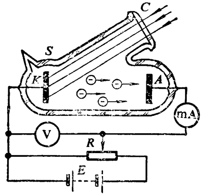 图 7–2 是研究光电效应规律的实验装置简图。其中 S 是抽成真空的容器,C 是石英窗口,紫外光和可见光都可以通过它射到容器里的金属板 K 上。在 K 的对面有另一金属板 A,K 和 A 组成一对电极。象图中那样把 K 跟电池组的负极相连,A 正极相连,电路接好后,电流表指示没有电流,因为极板 K 和 A 之间是断开的,用一定强度的光照射极板 K,它发射出的光电子运动到极板 A 时,电流表的指针就发生偏转,指出电路中产生了电流,这电流是由光电子产生的,叫做光电流。