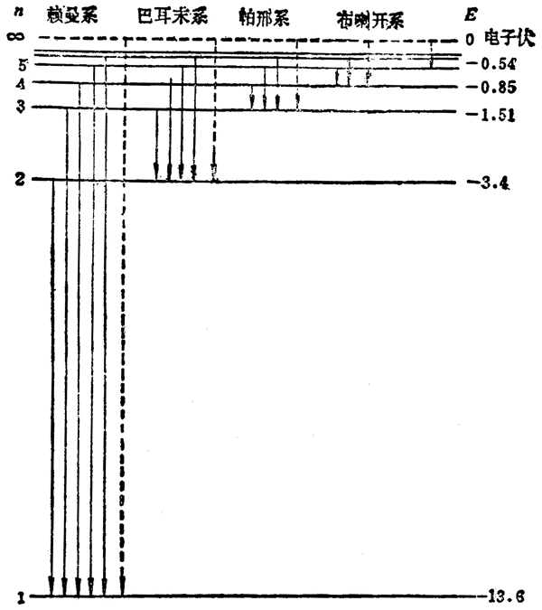 由此可知,氢光谱的巴耳末系是电子从 n = 3,4,5,6 等能级跃迁到 n = 2 的能级时辐射出来的。