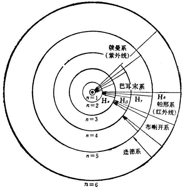 上面的公式叫做巴耳末公式。当 n = 3,4,5,6 时,用这个公式计算出的四条光谱线的波长跟上面从实验测得的 Hα、Hβ、Hγ、Hδ 四条谱线的波长符合得非常好,于是人们把氢光谱的这一系列谱线叫做巴耳末系。巴耳末公式反映了氢光谱这一系列谱线的规律性。