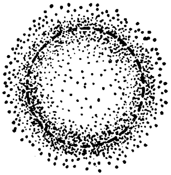 建立在量子力学基础上的原子理论,核外的电子并没有确定的轨道,从薛定谔方程的解我们只能知道,核外电子在原子内各处出现的几率。氢原子在基态时,它的电子经常出现的几率最大的区域是以原子核为中心的一个球壳,这个球壳的半径为 0.53×10−10 米,这个数值跟用玻尔原子理论计算的氢原子基态的轨道半径相同。可见,玻尔的电子轨道,只不过是电子出现几率最大的地方。电子在核外的运动情况,通常用“电子云”来形象地描述。这就是用小黑点的稠密与稀疏来代表电子在核外各处出现的几率的大小,这样我们就可以画出原子的电子云图,图中原子核好象是被一层云雾笼罩着,云雾浓度大的地方,电子出现的几率大,云雾浓度小的地方,电子出现的几率小。于是电子云的概念就代替了玻尔理论中电子轨道的概念,图 8–6 是氢原子基态的电子云。