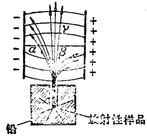 铀、钋和镭放出的射线到底是什么呢?科学家们利用电场或磁场来研究放射线的性质,确定了放射线的组成。图 9–1 表示利用电场进行研究的实验:把放射性样品放在铅块的窄孔底上,在孔的对面放着照相底片,没有电场时,在显影后的照相底片上可以发现正对着窄孔有一个暗斑,说明射线顺着窄孔一直射到底片上,使它感光,在铅块和底片之间放上一对电极,使电场的方向跟射线的方向垂直时,在显影后的底片上出现三个暗斑,说明在电场作用下,射线分成三束(图 9–1)。其中有两束向相反方向偏转,表明这两束射线是由带电粒子组成的,而且两种粒子带有异种电荷;另外那束不发生偏转,表明这束射线是中性的,从暗斑的位置知道,带正电的射线偏转较小,带负电的射线偏转较大,通常把带正电的射线叫做 α 射线,带负电的射线叫做 β 射线,不发生偏转的射线叫做 γ 射线。
