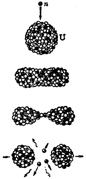 当中子打进铀 235 后,就形成处于激发状态的复核,复核中的核子由于激烈运动,使核变成不规则形状,核子间的距离增大。由于核力只在极短距离内发生作用,当核子间距离增大时,核力迅速减小,因而不能克服质子间的库仑斥力使核恢复原状,核就分裂成两部分,同时放出几个中子。轴核裂变的许多可能的核反应中的一个是: