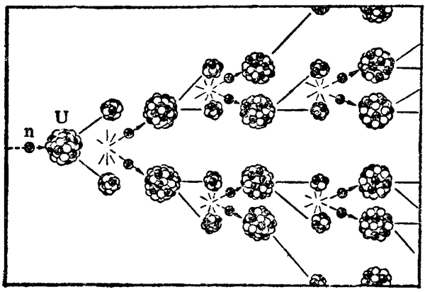 铀核裂变时,同时放出 2 ~ 3 个中子,如果这些中子再引起其他铀核裂变,就可使裂变反应不断地进行下去,这种反应叫做链式反应(图 9–13)。