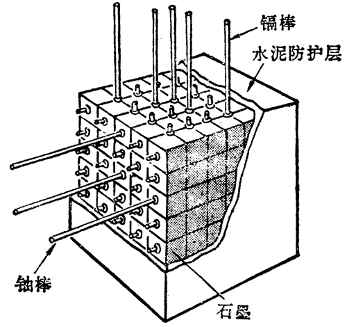 图 9–14 是原子反应堆的示意图,反应堆里用的铀棒是天然铀或浓缩铀(其中铀 235 的含量比天然铀高)。由于裂变产生的是速度很大的快中子,很容易被铀 238 俘获而不发生裂变,所以必须设法使中子在碰上铀 238 前降低速度。为此在铀棒的周围放上原子量比较小、又不吸收或很少吸收中子的物质,如石墨、重水或普通水(普通水吸收中子的几率较大,但可用在用浓缩铀做原料的反应堆中),快中子跟这些物质的原子核碰撞后,能量减小,变成慢中子。这种用来使中子减速的物质叫做减速剂。速度跟热运动速度差不多的慢中子(能量约为 1/40 电子伏)叫做热中子。热中子碰到铀 238 时会弹射回来,却容易被铀 235 俘获而引起裂变。为了调节中子数目以控制反应速度,还需要在铀棒之间插进一些镉棒,镉吸收中子的能力很强,当反应过于激烈时,使镉棒插入深一些,让它多吸收一些中子,链式反应的速度就会慢一些;当反应过于缓慢,达不到所需功率时,使镉棒插入浅一些,让它少吸收一些中子,链式反应速度就可以增大。这种镉棒叫做控制棒。用电子仪器自动地调节控制棒的升降,就能使反应堆保持一定的功率安全地工作。