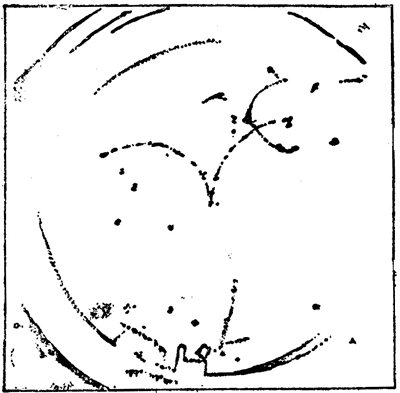 相反的过程也能够发生。例如,能量超过 1.02 兆电子伏的 γ 光子穿过铅板时,会同时产生电子和正电子,通常把这一对正负电子叫做电子-正电子偶。图 9–16 是在云室中看到的它们的径迹,由于电子和正电子所带的电荷相反,它们在磁场中向相反的方向偏转,这个反应可表示为: