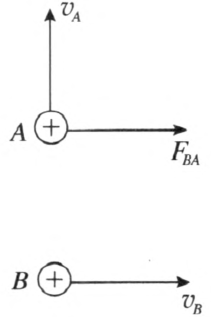 如图 1–6 所示,两个点电荷 A、B 在同一个平面内沿不同方向运动。在某一时刻,点电荷 B 通过激发的磁场作用于点电荷 A 的力为 FBA,而点电荷 A 激发的磁场在此刻对点电荷 B 没有作用力。因此,力 FBA 在此刻不存在反作用力,牛顿第三定律不再成立。但是,动量守恒定律仍然成立。不过,这里的动量不仅包含电荷的动量,还应包含场的动量。当我们考虑到上述这点时,动量守恒定律便是普适的定律。