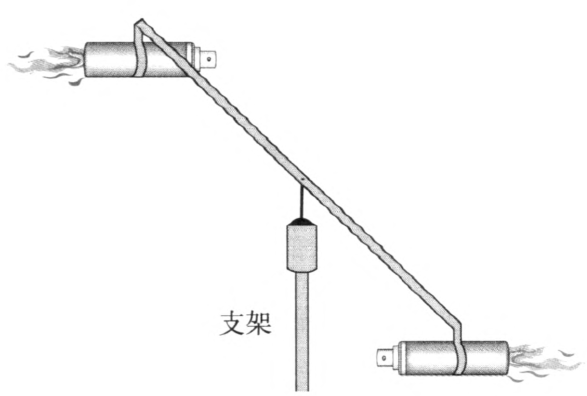 如图 1–7 所示,在铁支架的立柱顶端装上顶轴,在旋转臂的瞬侧各装一只火箭筒,再把旋转系统放在顶轴上。往火箭筒内注入约 4 mL 的酒精,并在火箭筒下方的棉球上滴少量酒精,点燃酒精棉球,火箭筒内的酒精蒸气从尾孔中喷出并被点燃。这时可以看到火箭旋转起来,带着长长的火舌,并伴随有呼呼的声响。