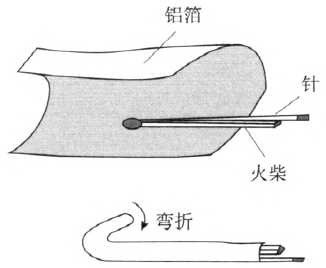 将一根火柴和一根缝被的大针并在一起,用铝箔将它们紧紧地包裹起来,再将有火柴头的一端的铝箔弯折过来密封捻紧,如图 1–8 所示。然后在靠近尾部的地方装上定向尾翼,把针拔出,就成了一个很简单的反冲火箭。