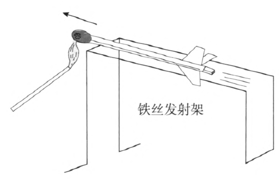 实验时,把小火箭放在铁丝架上,点燃一根火柴,对准铝箔筒包有火柴头的部位加热,当温度升高到火柴头的燃点时,箔里的火柴便被点燃,使周围的空气急剧膨胀,气体从尾口高速喷出。由于反冲作用,火箭筒便从架上向前飞了出去,如图 1–9 所示。