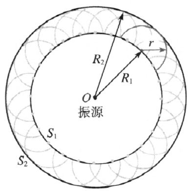 惠更斯原理是关于波面传播的理论,它的表述可通过图 3–12 来说明。我们考虑在某一时刻 t 由振源发出的波扰动传播到了波面 S1。惠更斯提出:S1 上的每一面元可认为是次波的波源。由面元发出的次波向四面八方传播,在以后的时刻 tʹ 形成次波面。在各向同性的均匀介质中,次波面是半径 r = vΔt 的球面,这里 v 为波速,Δt = tʹ − t。惠更斯认为:这些次波面的包络面 S2 就是 tʹ 时刻总扰动的波面。