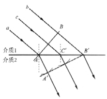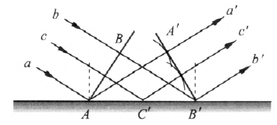 如图 3–13 所示,一列平面波到达两种介质的界面,AB 是这列波的一个波面。由于入射波的传播方向与界面并不垂直,a、c、b 三条波线并不同时到达界面,它们到达界面时产生子波的时间也就有先有后,子波传播的距离也就有远有近。当波面上的 B 点刚刚到达界面上的 Bʹ 点时,A、Cʹ 两点发出的子波的波面如图中两小段圆弧所示,它们的包络面为图中的 AʹBʹ,这是反射后新的波面,aʹ、cʹ、bʹ 三条射线与波面 AʹBʹ 垂直,是反射波的波线,代表了反射波的传播方向。