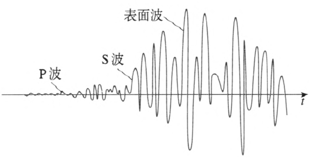 发生岩层破裂的震源一般在地表下几千米到几百千米的地方,震源正上方地表的那一点叫震中。从震源和震中发出的地震波在地球内部有两种形式:纵波和横波,它们被地震学家分别称为 P 波(首波)和 S 波(次波)。P 波的传播速度从地壳内的 5×103 m/s 到地幔深处的 14×103 m/s。S 波的速度较小,约 3×103 ~ 8×103 m/s。两种波速的区别被用来计算震源的位置。P 波和 S 波传到地球表面时会发生反射,反射时会产生沿地表传播的表面波。表面波也有两种形式:一种是扭曲波,使地表发生扭曲;另一种使地表上下波动,就像大洋面上的水波那样。P 波、S 波以及表面波的到达都可以用地震仪在不同时刻记录下来(图 3–16)。