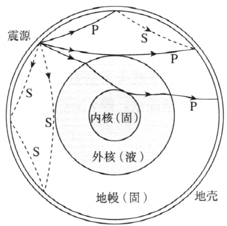 地震波中的 P 波可以在固体和液体中传播,而 S 波则只能在固体中传播(因为液体不可能发生切变),它们又都能在固体和液体交界面处反射或折射。因此,通过对地震波的详细分析可以推知它们传播所经过的介质分布情况。目前对地球内部结构的认识几乎全部来自对地震波的分析(图 3–17)。人造地震可以帮助科学家了解地壳内地层的分布,它是石油和天然气勘探的一种重要手段。此外,对地震波的分析也是检测地下核试验的一种可靠方法。