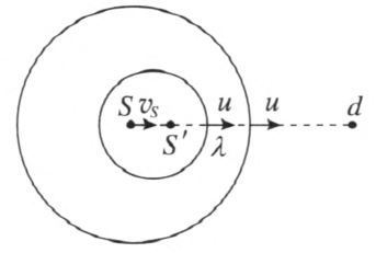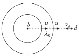 如图 3–18 所示,先考虑静止于均匀介质中的点波源 S,S 每隔一个周期 T0 = \(\frac{1}{{{f_0}}}\) 向外发出一个等相面(球面),等相面以速度 u 向外传播,相邻两等相面间的距离为波长 λ0,u = λ0f0。如果观察者从 d 沿 S、d 连线向 S 运动,速度为 vd,则等相面相对观察者的运动速度为 u + vd。相邻等相面经过观察者的时间即周期 T = \(\frac{\lambda }{{u + {v_d}}}\) = \(\frac{1}{f}\),所以 f = \(\frac{{u + {v_d}}}{u}\)f0 > f0。如果观察者远离波源运动,则 f = \(\frac{{u - {v_d}}}{u}\)f0 < f0。观察者感到的波的频率变化是等相面相对于观察者的速度变化产生的。