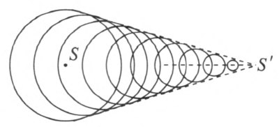让我们以点波源为例来说明。设 S 为一个点波源,其频率为 f0。在均匀且各向同性的介质中发出球面波.等相面(例如波峰面)是以 S 为中心的球面,设 u 代表介质中波速的大小。