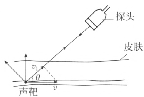 利用超声波的多普勒效应测定血流速度的原理如图 3–23 所示。超声探头产生一束频率为 1 ~ 10 MHz 的超声波束,遇到运动中的血细胞(称为声靶)时,沿发射方向返回,再被探头所接收。
