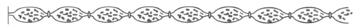 理论上,用橡皮绳演示横波现象最为直观,但由于脉冲传播速度过快以及反射波的干扰,演示现象很不明显。教学时.宜用线密度较大、张力较小的橡皮绳。可用直径 10 mm、长 6 m 左右的乳胶管,在管内填入密度较大的金属颗粒或粉粒(如铁粉和铅粒),并每隔 1.5 ~ 2 cm 用线结扎起来.其结构如图 3–24 所示。