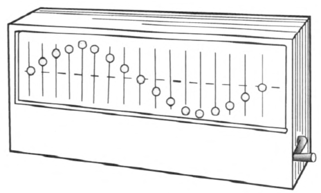 箱式模拟横波演示器的外形如图 3–26 所示。逆时针转动摇柄,演示屏上的质点就排成一条水平线;顺时针转动摇柄,各个质点就依次竖直振动起来。教师可以用它来配合讲解,说明波的特点,也可以说明波的图像。