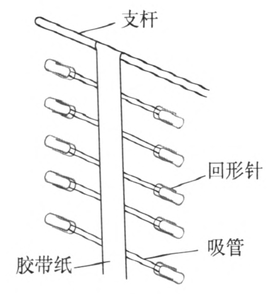 仪器的结构如图 3–29 所示。使用大约 24 根饮料吸管、若干回形针和一条胶带纸。展开胶带纸,每隔 25 mm 左右粘一根吸管。每根吸管两端各别上一个回形针。把胶带的一端挂在铁架台的横杆上,拨动上端(或下端)的吸管,使回形针左右振动,就可以看到横波的传播现象。