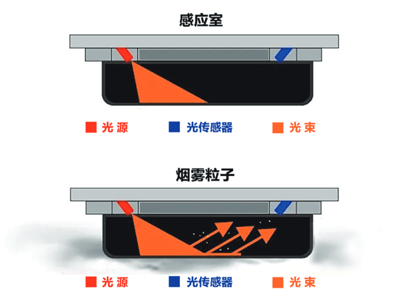 烟雾报警器主要分为“光电式”和“电离式”两种。光电式烟雾报警器又可以细分为减光式和散射光式——散射光式光电烟雾报警器内部像一个小迷宫,一边装着发光二极管(LED),另一边装着光敏传感器,LED 会每 10 秒发射一束脉冲光。正常情况下,LED 发出的光线照不到传感器;而当烟雾进入腔室时,光线会发生散射,部分光线会到达传感器。传感器将光信号转换为电信号,然后触发警报,提醒人们注意火灾。减光式光电烟雾报警器则与之相反。在正常情况下,光源发出的光会穿过空气并到达传感器,而在有烟雾时,发光器件的发射光受到烟遮挡,使传感器接收的光量减少。与此同时,电路会检测光强度,如果光强度低于指定阈值,就会发出警报。