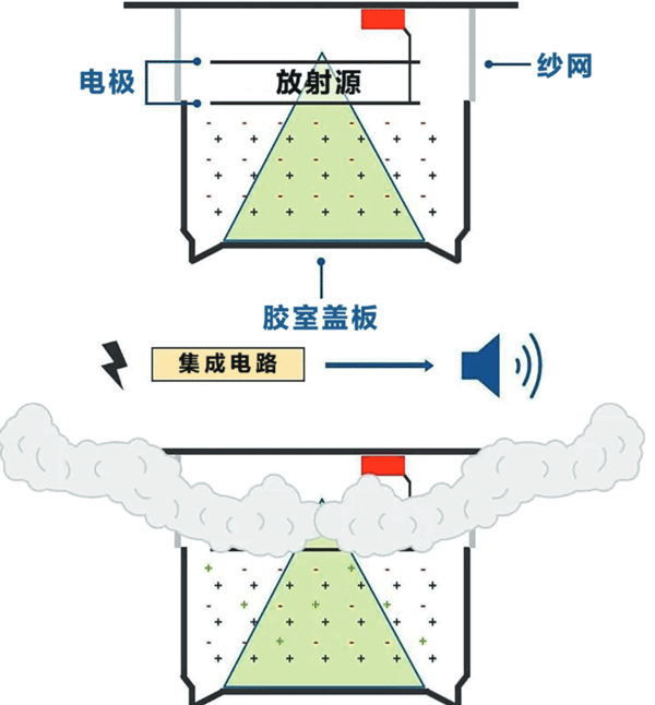 电离式烟雾报警器才会用到辐射物质,它的核心是极少量的“镅–241放射源”。这个放射源会持续释放 α 粒子,使得一些空气分子电离,一些粒子带正电,一些粒子带负电。电离烟雾报警器内部还有两个电极,正极和负极之间形成一股稳定的电流,相当于一条不停流动的“小溪”。当烟雾颗粒进入报警器后,就会阻碍这条“小溪”流动。电流一减弱,报警器的电路立刻察觉异常,警报声就会响起来。这种设计对可见烟和不可见燃烧产物都极为敏感,能在火灾初期就发出警告,为人们逃生争取宝贵时间。