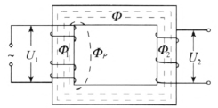 如果铁芯有漏磁通量 Φp(为简化讨论,设漏磁通量仅存在于原线圈一侧),如图 3–12。则穿过副线圈的磁通量 Φ2 仅是电流 I0 激起的磁通量 Φ1 的一部分(一般情况是很大一部分)。通常把 Φ2 = Φ1 = Φ 称主磁通量或工作磁通量。漏磁通量不穿过副线圈,但在原线圈中产生与 u1 同相的感生电动势。