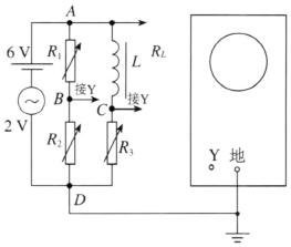 电路如图 3–13 所示。电源使用 6 V 干电池和 2 V、50 Hz 交流电源(学生实验电源)串联,组成直流与交流成分均有的电源。电感 L 可以用可拆变压器的次级线圈或其他电感线圈,L 的直流电阻为 RL,可用欧姆表测出。R1、R2、R3 为电阻箱。RL 与电阻 R3 之和等于电阻 R1 与 R2 之和,且 R1 = RL,R2 = R3。