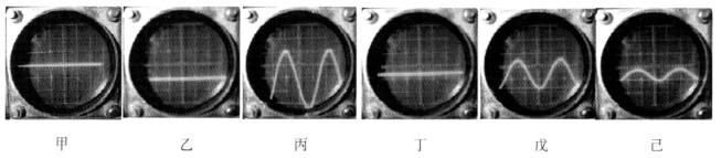 实际观察情况举例。电感用小型变压器的次级线圈,其直流电阻 RL = 10 Ω;R3 为 10 Ω;电阻箱 R1 调整为 10 Ω,电阻箱 R2 调整为 10 Ω;直流电压 6 V、交流电压 2 V;学生示波器 Y 轴衰减“×100”挡,X 轴扫描频率 10 ~ 100 Hz,微调扫描频率,出现 2、3 个波形。波形如图 3–14 所示,图中的尺寸相同。甲图为 0 参考点;乙图为 6 V 直流电压的位置,约大于 0 参考点 1 大格;丙图为 A 点电压波形即电源电压波形;丁图为电阻 R2、R3 上的直流电压分压的位置,其大小约为乙图的一半;戊图为电阻 R2 上的电压波形,是以丁图为横轴的正弦交流电压波形;己图为电阻 R3 上的电压波形,是以丁图为横轴的正弦交流电压波形,其幅度小于戊图的幅度,因为通过 R3 上的交变电流受到电感 RL 的阻碍作用。