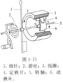 电磁式仪表的结构如图 3–15 所示。被测交变电流通入固定的线圈,当电流 I 的方向如图所示时,定、动两软铁片都被磁化,且磁极方向相同,因而互相推斥使动铁片转动,直到游丝产生的反力矩和推斥力矩平衡为止。电流越强,推斥力矩越大,指针偏转角度越大。当电流方向改变时,两铁片磁化后的极性都和图中相反,仍然互相推斥,所以指针仍保持在原来偏转的角度处。这种仪表按有效值刻度,由于刻度是不均匀的,精度较低,适合测量工频交变电流,多用于工业上的测量,如配电盘(柜)上的电压表、电流表就是电磁式仪表。